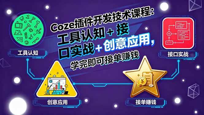 《Coze插件开发技术课程》=“工具认知+接口实战+创意应用”三合一:13节实操共230分钟,从0到1掌握聚合翻译、动态SVG、抖音去水印、图像生视频等热门插件开发,学完即可上线10款实用插件,接私单定价300-800元/个,学员7天人均新增收入2000+,可复用模板持续变现。